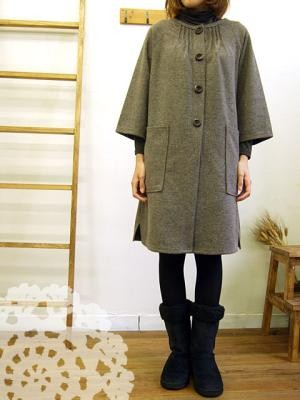 前開きのチュニク丈に仕上げました。広めの衿ぐり、ラグラン切替、広めの袖ぶりなど、インナーにニットアイテムを持ってきてもOKのゆったりサイズ。衿ぐりのタック、大きな丸ボタンとポケットがしっかりポイントを作ってくれます。