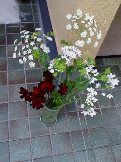 白いお花と深い赤の組み合わせ。