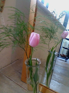 そんなSHOPのテンションにつられるように、今のSHOPのお花はド定番、チューリップです。横にあしらうグリーンもふわふわとやさしいものを。