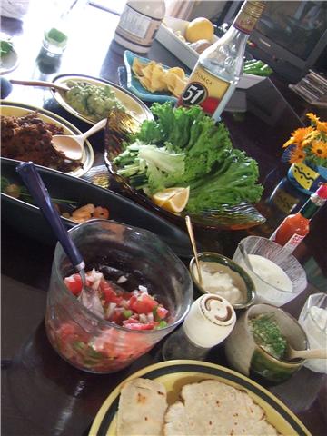 ヴァカモレ、ビーンズチリコンカン、えび、レモンクリームにディルやチヤイブを入れたソース、もちろんサルサ。