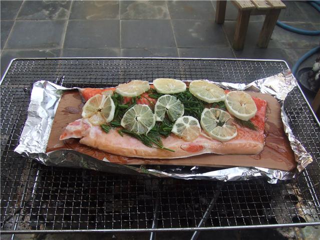 レシピによって差はありますが、3時間くらい水に浸した杉の板(一晩でもOK)に塩振って(板に!)サーモンをのっけて、オリーブオイルかけて、ディル、チヤイブ、レモン汁をかけ、仕上げはなんとメープルシロップ(砂糖の入ってないのです)