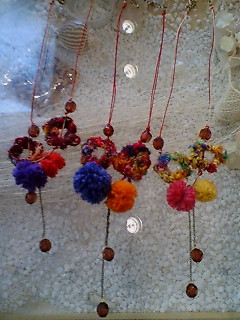 まず両端のわっか、これはネパールのシルク糸で編まれたもの、そして真ん中でころころしてるのは、ヘンプウールで作ったポンポンです。